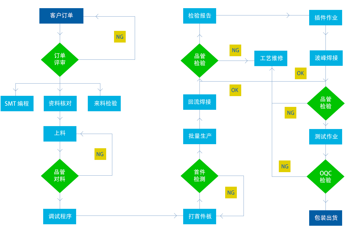 公司提供从零部件到PCBA一站式解决方案。目前公司拥有三星系列自动贴片线4条和波峰焊接线1条。贴片线具备贴装01005 (CHIP件)和0.4MM间距BGA (CHIPSET)贴装能力和工控板 波峰焊接能力。提供最快12小时交货服务。公司引进一套先进的自动首件检测系统,为品质保驾护航;